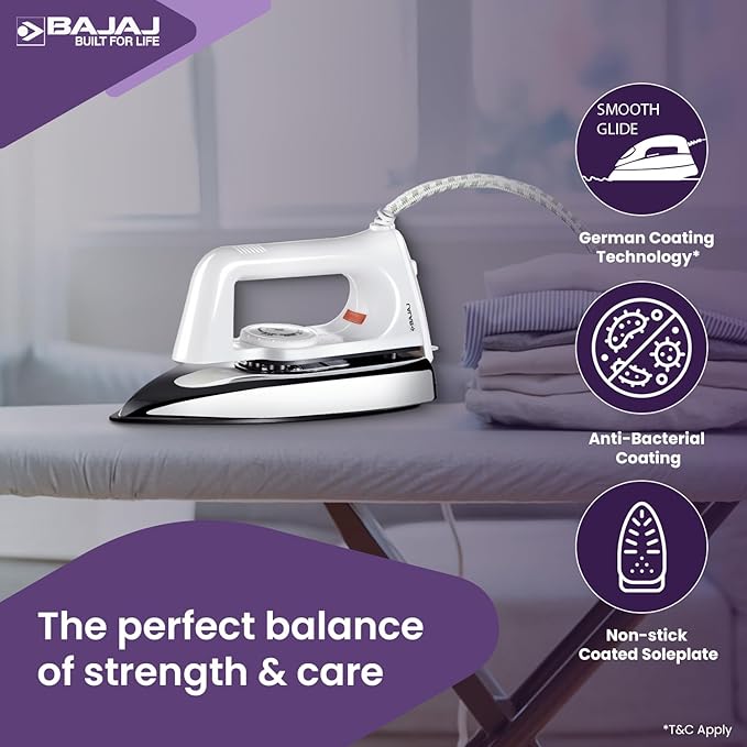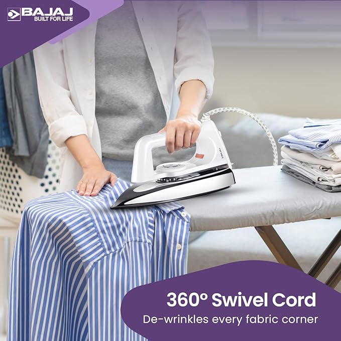 Bajaj Popular Plus 750W Dry Iron | Advanced Soleplate and Anti-Bacterial German Coating Technology | Lightweight | Cool Touch Handle | 360 Degree Swivel Cord | 2 Yr Warranty 【White】