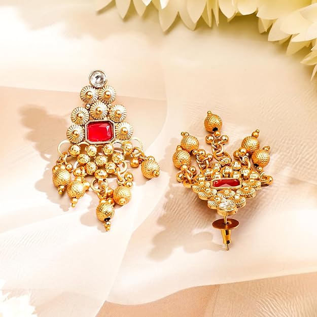 Rubans 24K Gold Plated Stylish Handcrafted Ruby, White Stone-Studded & Gold Beaded Traditional Set with Earrings for Women & Girls, Ideal for any Festive & Wedding Occasions